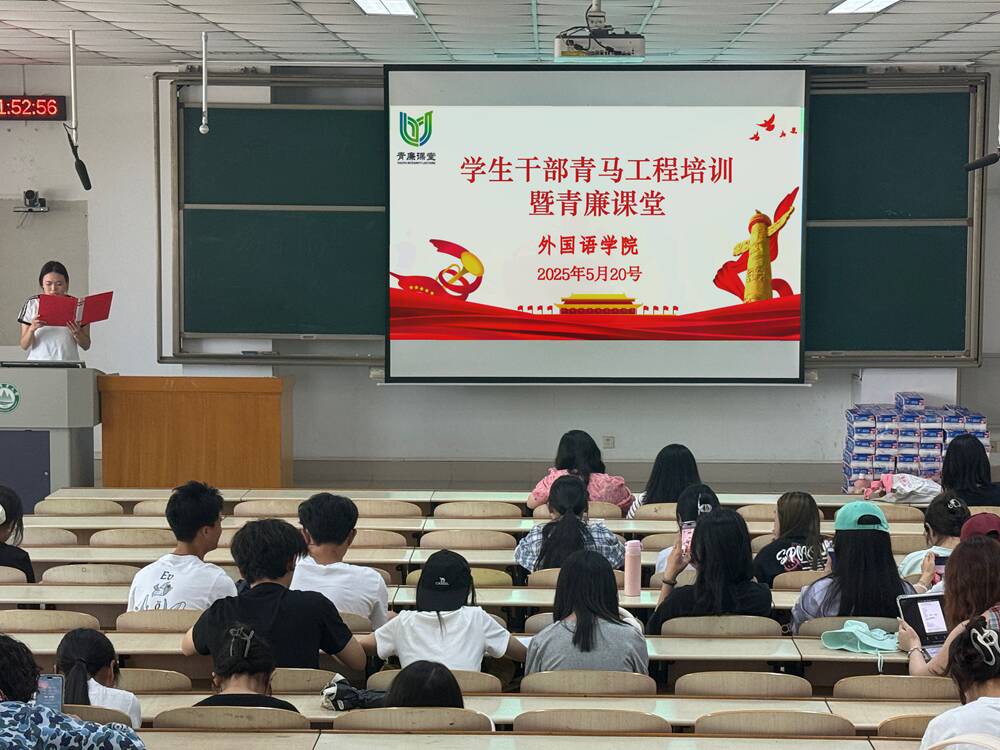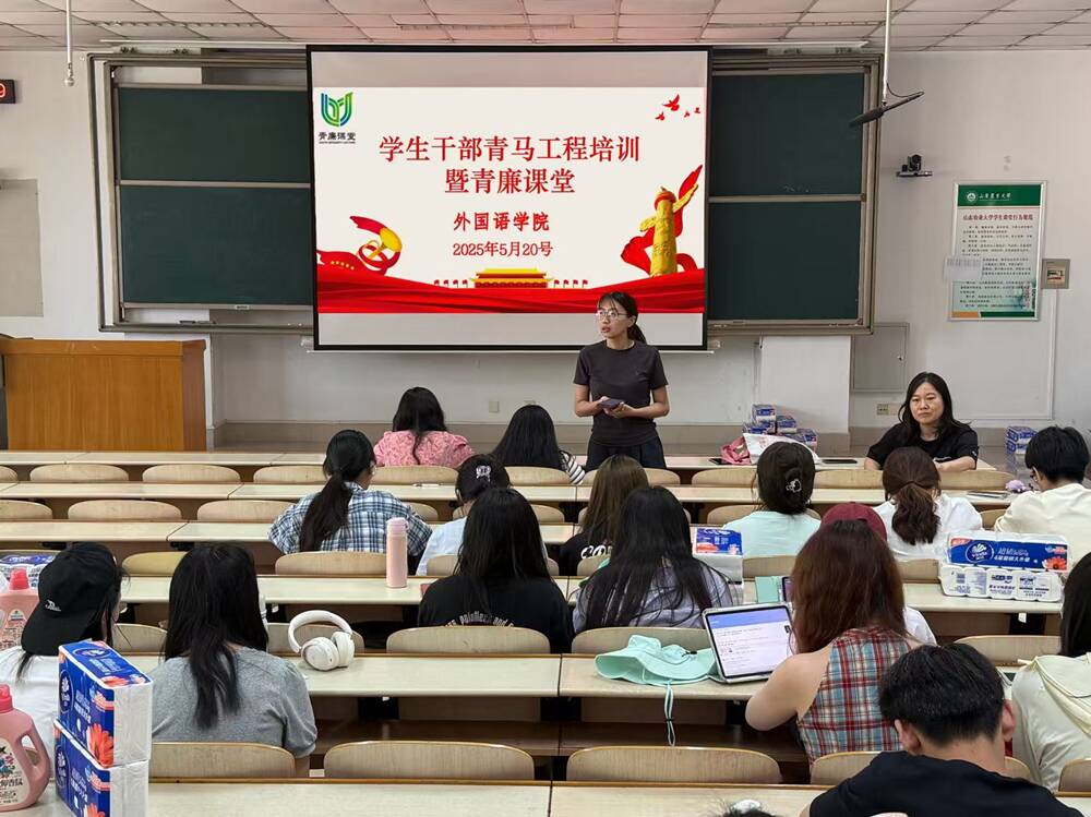 5月20日,外语学院在泮河校区综合楼N104举办学生干部青马工程培训暨青廉课堂,学院团委书记李娜、全体辅导员老师及全体学生干部参与此次培训会。