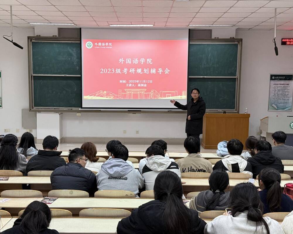 11月12日,外国语学院于泮河校区综合楼N203举办2027届毕业生考研规划辅导会。本次会议特邀学校十佳教师公共管理学院文产专业高国金老师担任主讲,2023级全体学生参加会议。