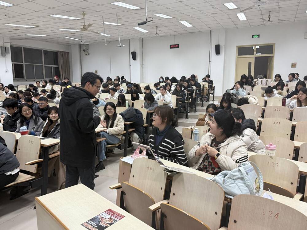 会上,高国金结合多年教学与考研辅导经验,以"精准择校,科学备考,就业导向"为核心主题,深入阐释院校专业选择与职业发展的深层逻辑。高国金聚焦法学非法硕、哲学、笔译、口译等热点报考专业,结合国内多所知名院校及特色专业实例,针对同学们在择校择专业方面的个性化诉求,从自身分数定位、学科实力匹配、地域资源优势等角度逐一分析,提出一系列针对性强、可操作性高的备考建议。讲座内容翔实、逻辑清晰,现场互动频繁、氛围热烈。