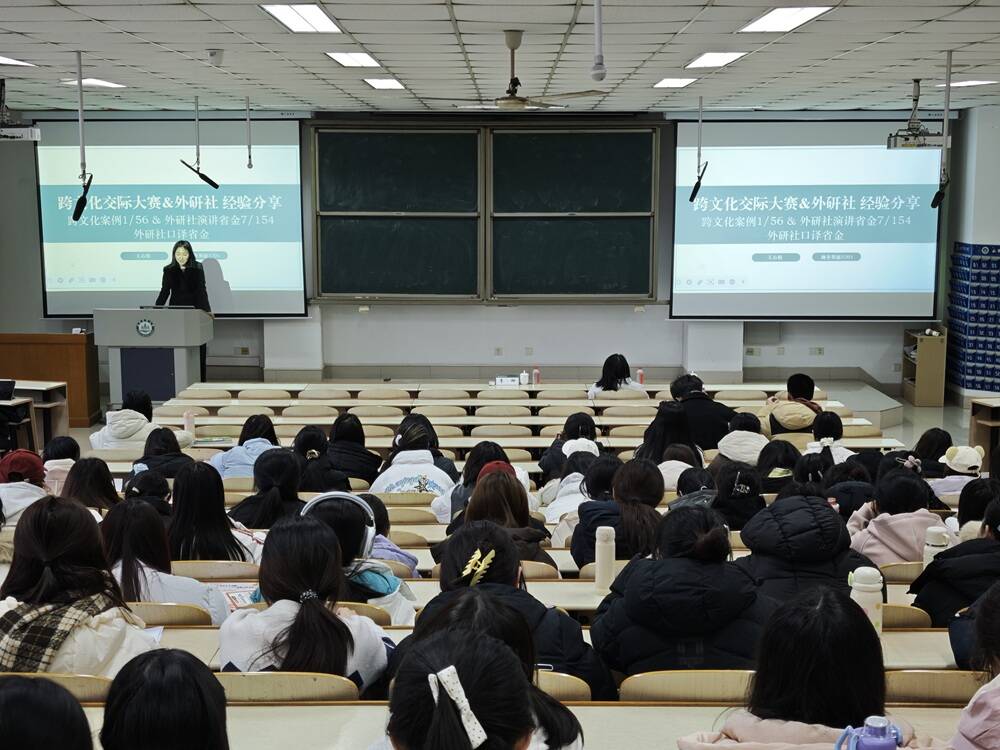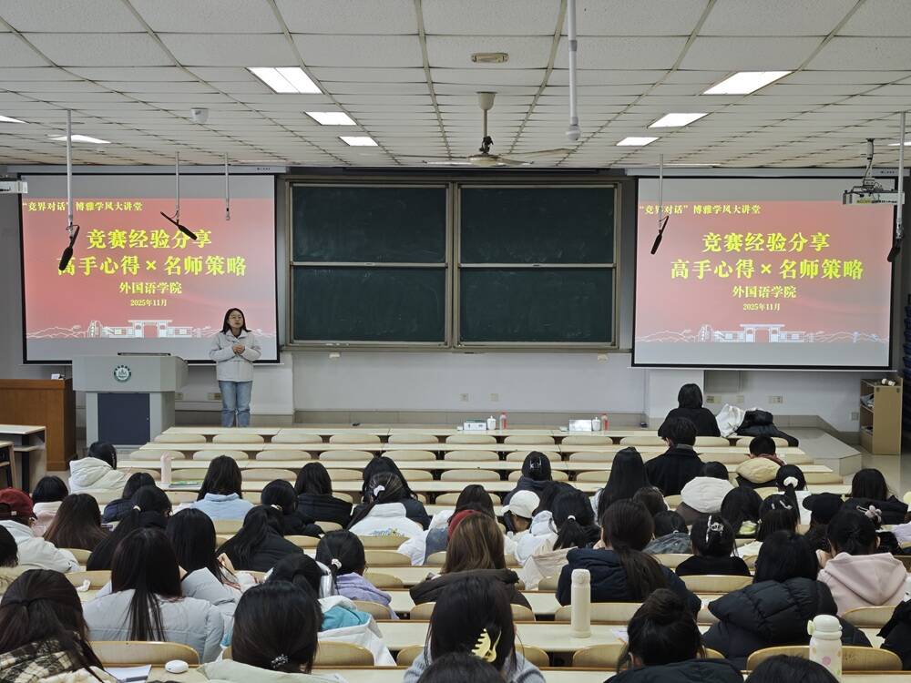 11月18日,外国语学院在泮河校区勤学楼N204举办博雅学风大讲堂,本次活动以“‘高手心得×名师策略’竞赛经验分享”为主题,邀请2022级英语专业赵琪缘、商务英语专业王心怡两位优秀学生代表进行经验分享,团委书记李娜、辅导员庞晓文及2024级、2025级全体学生参加。