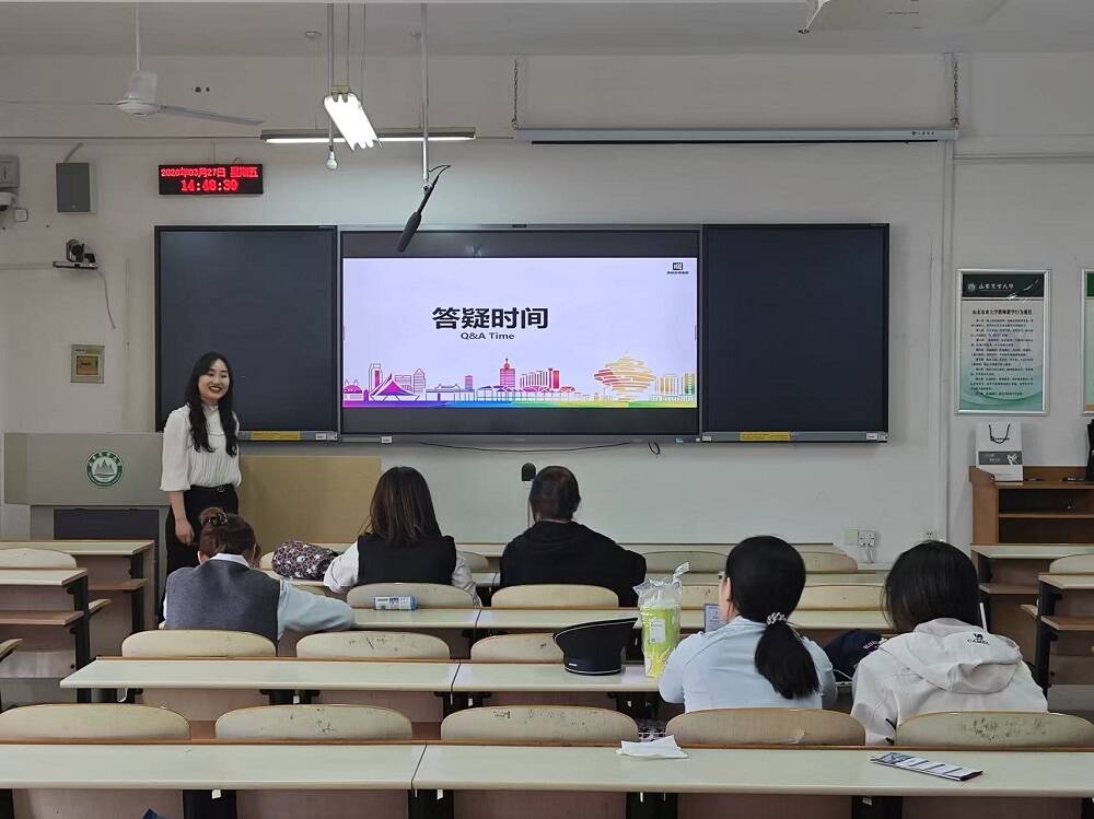 会上,集团负责人围绕集团风采、人才战略、面试指南、交流答疑四大环节展开分享:从发展历程、业务布局、行业成果等维度展现企业在多语种教学领域的领军实力与品牌影响力,深入解读人才培养体系与职业发展通道,分享实用的面试技巧。在交流答疑环节,意向毕业生踊跃提问,就岗位需求、晋升路径、企业前景等问题与负责人深入探讨,现场氛围活跃。