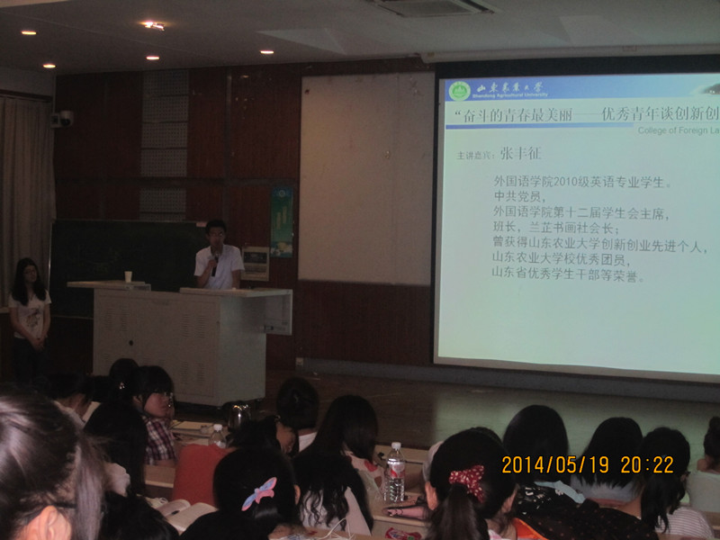 5月19日晚,外国语学院在东校区教学楼217举办“奋斗的青春最美丽”主题报告会。学院第十二届学生会主席张丰征和2011级学生魏丽君(‘21世纪中国日报杯’全国英语演讲比赛前十强)作为主讲嘉宾应邀与2013级全体同学们进行报告交流。