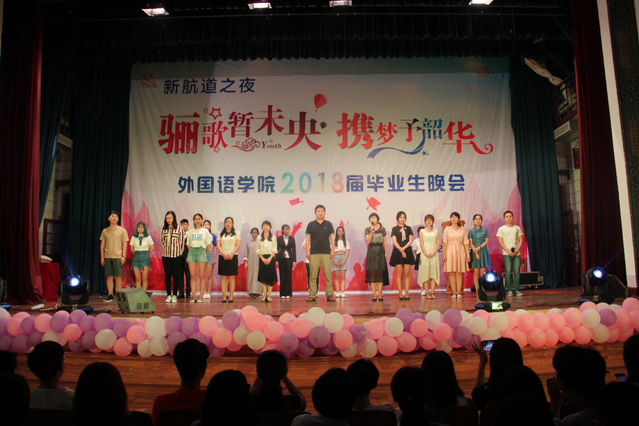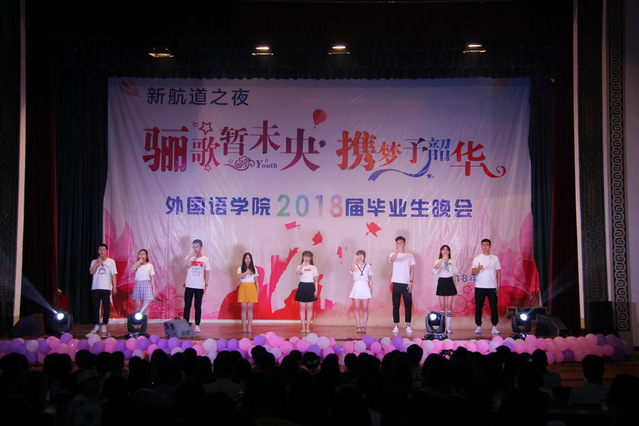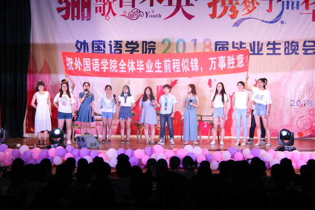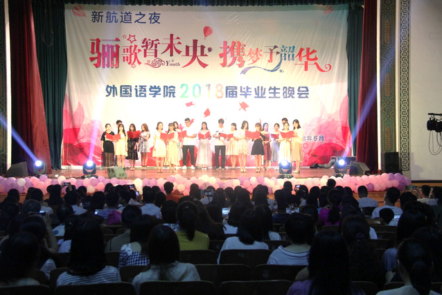 6月14日,外国语学院于北校区西礼堂举办“骊歌暂未央,携梦予韶华”主题毕业晚会,欢送2018届毕业生。学院领导、各系各专业主任、部分教师和全体辅导员出席晚会现场,为毕业生送别。