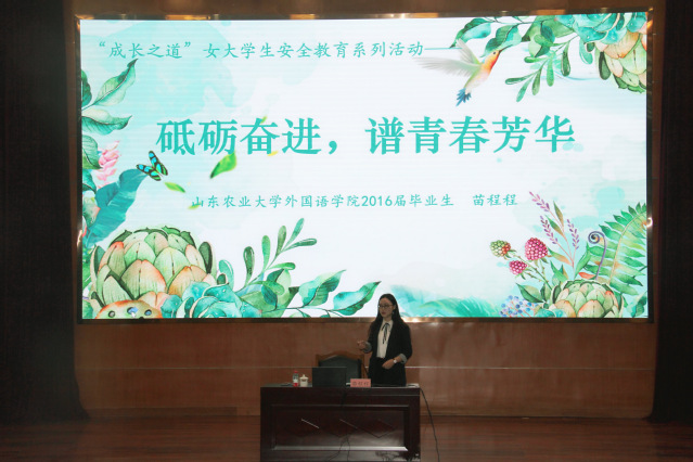 4月13日,外语学院举办“成长之道”女大学生安全教育系列活动之励志教育,学院邀请优秀校友苗程程为全体女生做报告。学院学生工作负责人、辅导员及全体女生参加报告会。