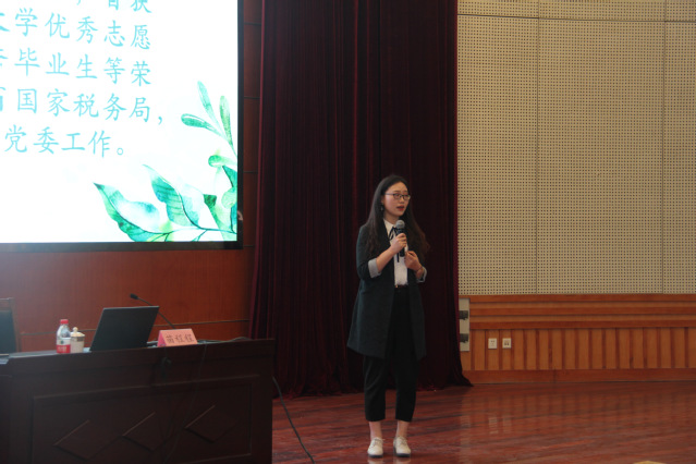 苗程程以“砥砺奋进,谱青春芳华”为主题,从专业学习、社团及学生干部工作、目标规划、求职深造、成长感悟等5方面为学生作报告。她结合自身成长发展中的一个个小故事,引导大家,作为新时代高校女大学生,更要自尊、自重、自立、自强;要时刻保持高昂的学习劲头,不轻易放过任何提升自我的机会;要敢于挑战自我,只要坚持到底,就能有意外的惊喜和收获。随后,她向学生分享国家公务员考试以及研究生考试的笔试、面试经验。最后,她把自己的成长感悟与大家共勉,希望学妹们做勤奋、乐观和有感恩之心的人。