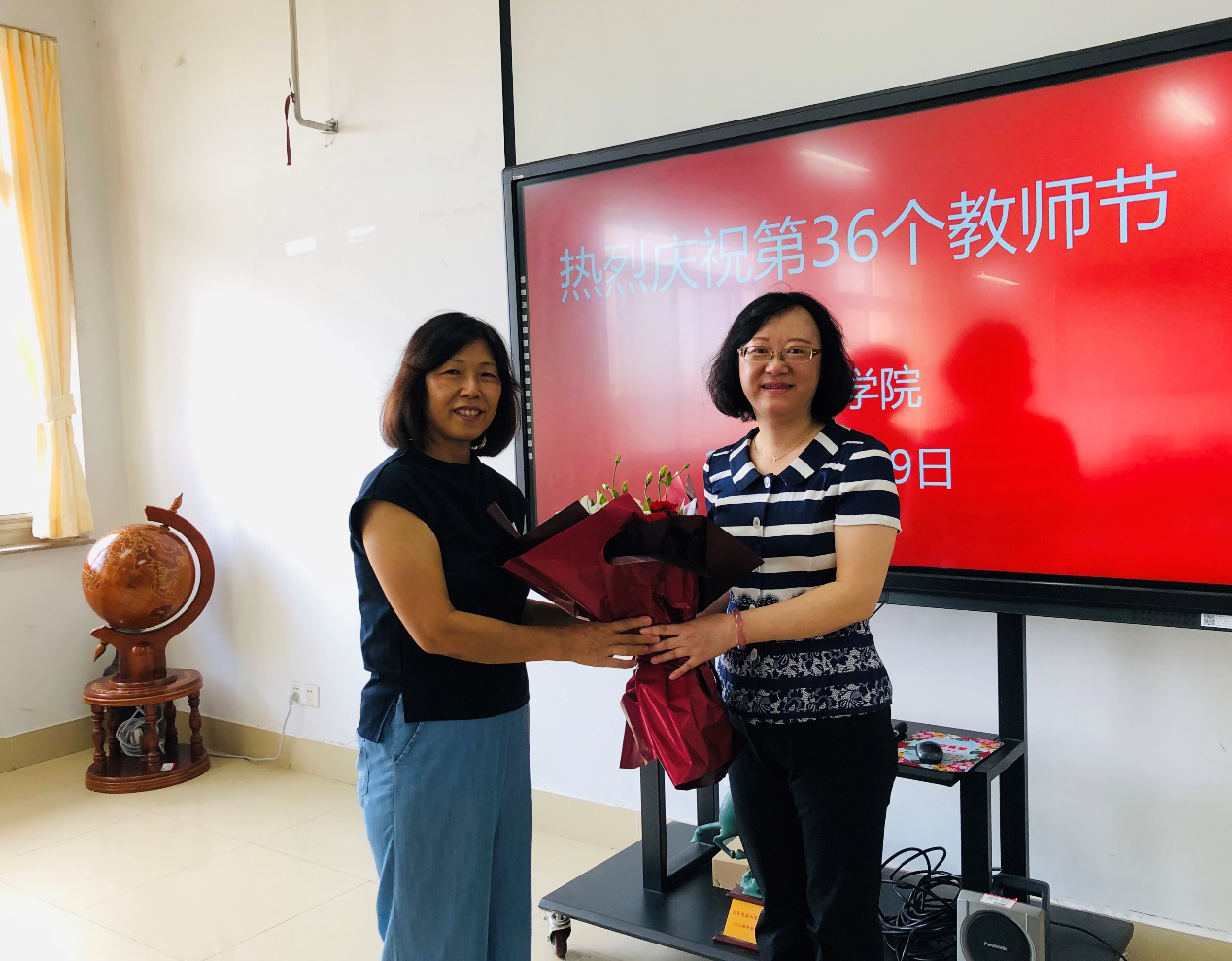 副校长张然向学院一线教师代表孟珍月副教授送上节日祝福与问候,感谢她多年来一以贯之兢兢业业教学,认认真真履行工作职责,以实际行动践行“十年磨剑”精神内涵,为日语系人才培养、为学院的辛苦付出和无私奉献。希望即将退休的孟老师一如既往关心支持学校、学院发展,为年轻老师传授宝贵经验,在农大外院大家庭里,让一代代的农大精神薪火相传,和系里老师们一起,共谋、共建、共享学校发展成果。
