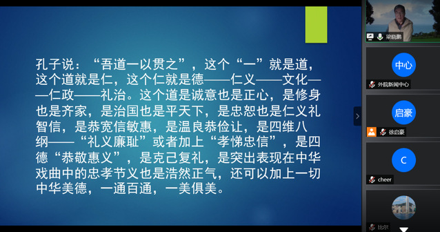 梁晓鹏教授以“学术外译与中华文化走出去”为题展开阐述。他认为,学术翻译并非是一蹴而就的,翻译需要长期积累沉淀,并详实论述了翻译行业需要关注的多个领域。接着,他详细讲解了目前翻译项目申报所面临的形势、存在的问题和相应解决方法,鼓励大家要积极参与出版社的项目,要仔细研究国家社科出版社内容等。最后,他以儒学孔子的古文为例,进行翻译示范并从翻译技术层面和策略层面为大家提出意见和建议。互动环节中,梁晓鹏就师生们提出的翻译问题和申报问题逐一进行解答,并给予具体指导。