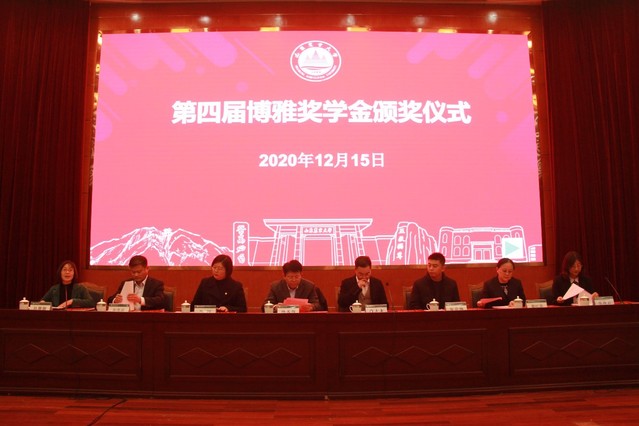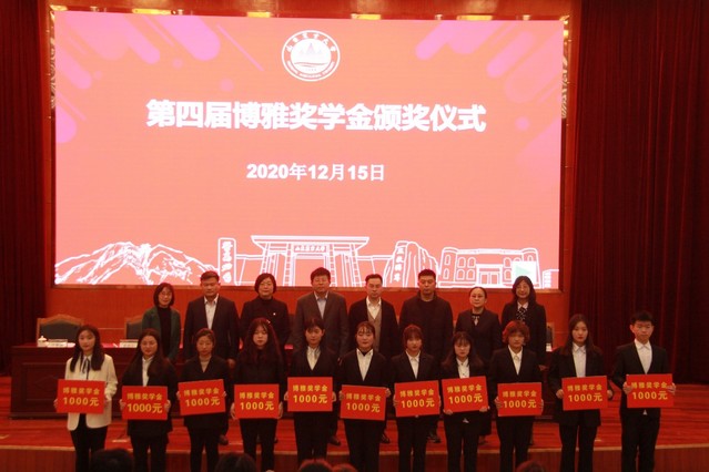 12月15日,学校颁发第四届博雅奖学金,外语学院代琦琦等11名学生获得奖励。学校党委副书记杨天梅,山东中品一禾餐饮有限公司总经理段大龙,学工处、校团委和外语学院相关负责同志、部分师生代表参加活动。