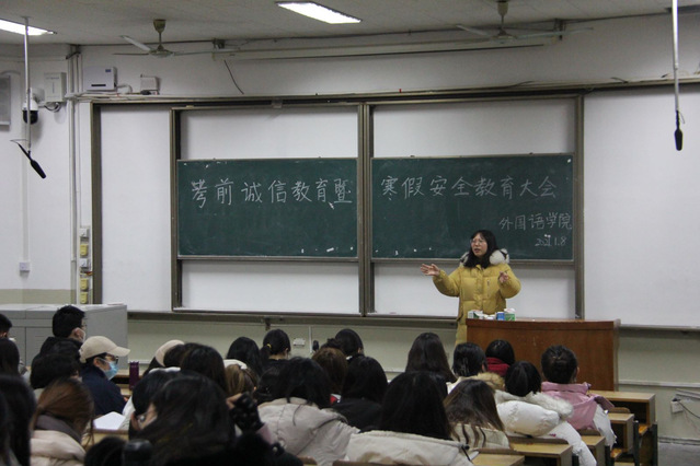 1月8日,外语学院分年级举办考前诚信暨寒假安全教育大会,全体辅导员和全体学生参加会议。