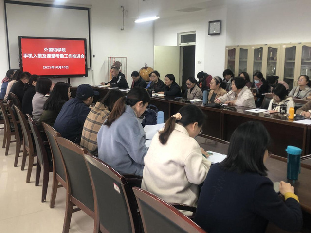 10月26日,外语学院在文理大楼321召开手机入袋及课堂考勤工作推进会,学院班子成员,系主任及副主任,专业主任,班主任以及全体辅导员参加会议。