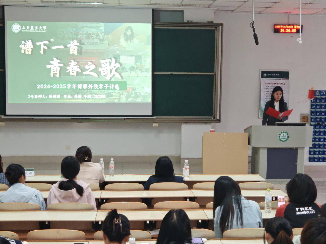 评选现场,各位选手借助精心制作的PPT,从优异的学习成绩、无私的志愿服务经历、出色的组织能力、精彩的竞赛活动等多个维度,全方位、立体式地展示了自身的综合素养与成长历程。最终,2022级庄梦洁、王志慧、王心怡、沈裕波,2023级王语馨、孙澜娣、王颢霖、楼晟媛、李晓薇、舒一汀10位同学凭借卓越的表现脱颖而出,被评选为第五届“博雅外院学子”。