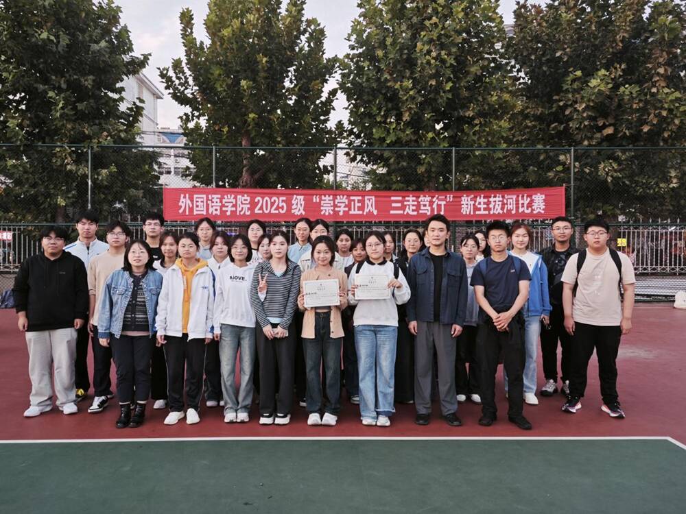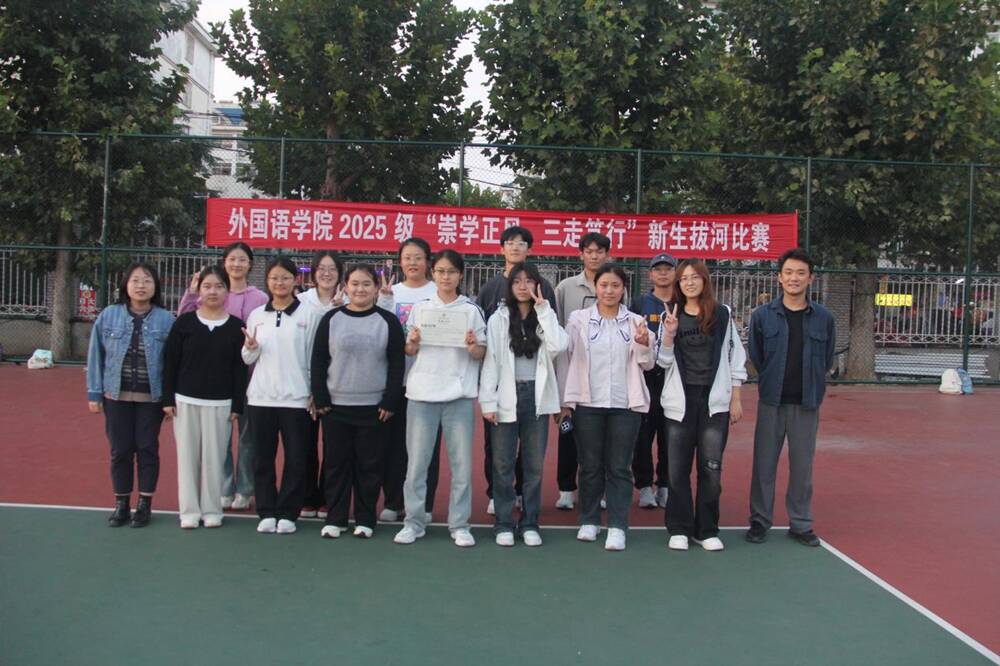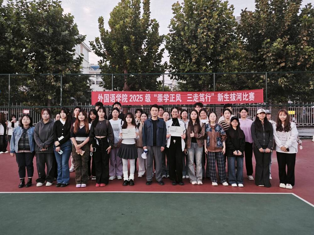为丰富新生校园生活、强化班级凝聚力,落实“走下网络、走出宿舍、走向操场”的“三走”育人号召,10月14日,外国语学院在泮河校区北操场排球场举办2025级“崇学正风 三走笃行”新生拔河比赛。辅导员及部分2025级同学参加活动。