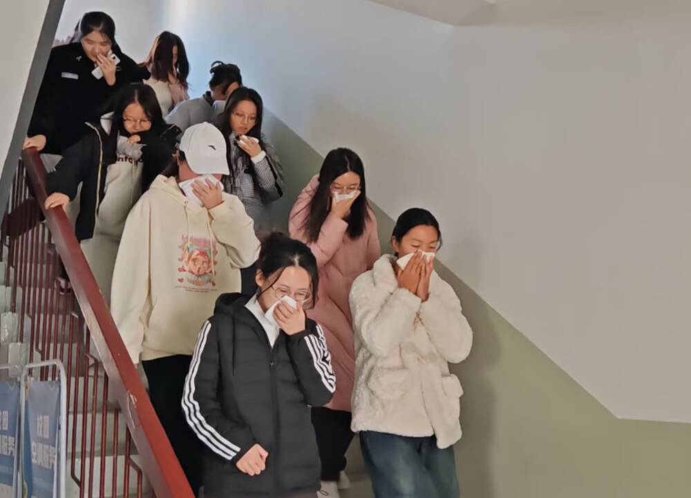 上午11时,宿舍楼火警信号响起,全体学生立即停止活动,沿指定疏散路线低姿前进,以湿布捂住口鼻迅速、有序撤离至安全集合点。本次演练涵盖消防安全疏散、逃生自救实操、应急处置流程讲解等核心内容。孙晓彤结合多起校园火灾案例,系统讲解日常生活中各类火灾的预防逃生技巧及消防器材操作规范。要求同学们将安全知识内化于心、外化于行,沉着应对紧急情况,守护自己与他人生命安全。整场演练组织严密、环节清晰,有效强化师生消防安全意识与实战应对能力。