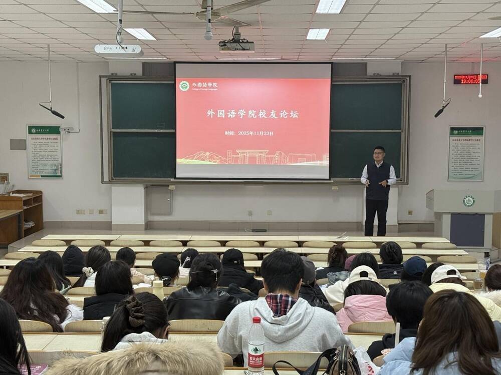 11月23日,外国语学院校友论坛在泮河校区勤学楼N303成功举办,本次活动特邀山东农业大学外国语学院2012级俄语专业优秀校友马德甲主讲,学院团委书记李娜及2025级全体学生参加此次活动。