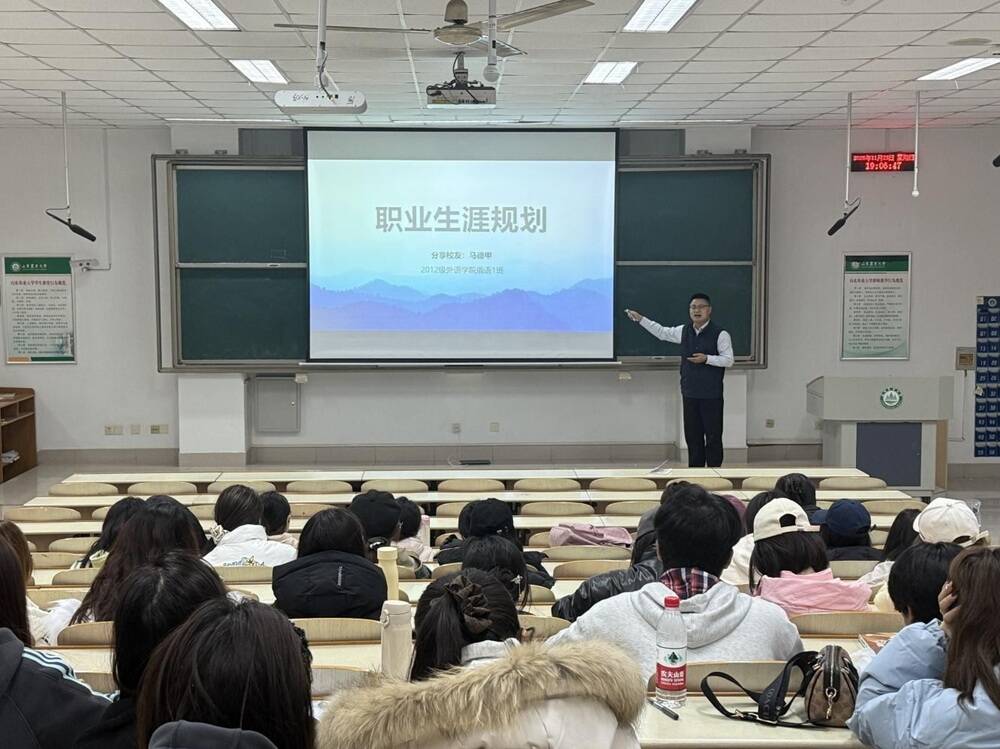 讲座中,马德甲以“职业生涯规划”为题,从大学生职业选择的实际困惑切入,系统解读职业规划的定义、个体规划路径及核心价值。他围绕“自我定义”“职业倾向”等话题与学生展开互动讨论,结合自身经历与真实案例,重点阐述如何通过专业适配性、个人兴趣契合度及收入预期匹配等核心因素,科学规划人生职业方向。针对大学阶段的能力提升,马德甲呼吁外国语学院学子:“早规划、多读书、广交友、强专业,以复合型素养夯实职业竞争力。”
