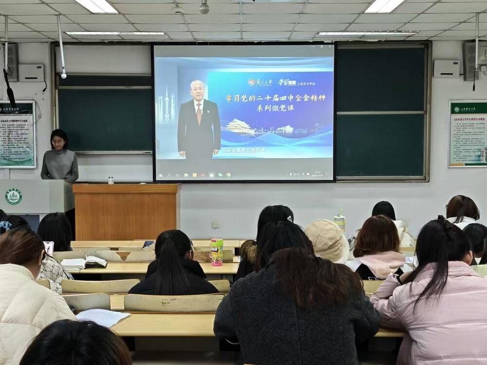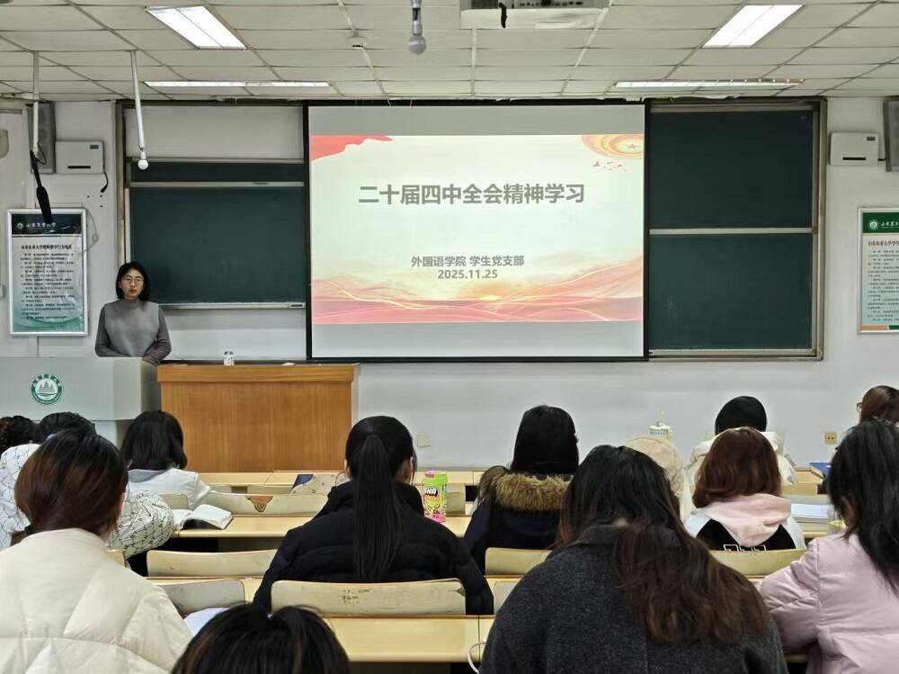 2025年11月25日,外国语学院学生第一、二党支部在泮河校区勤学楼W305开展主题党日活动暨青廉课堂,深入学习党的二十届四中全会精神,全体学生党员参会,学生第二党支部书记孙晓彤为党员上党课。