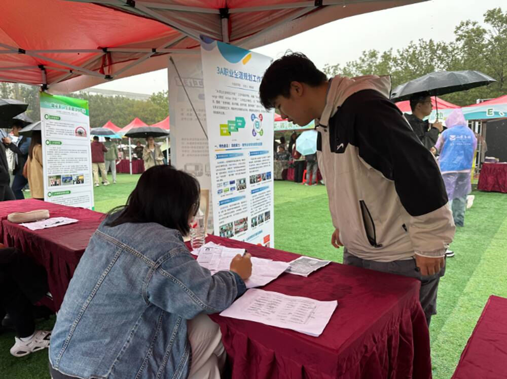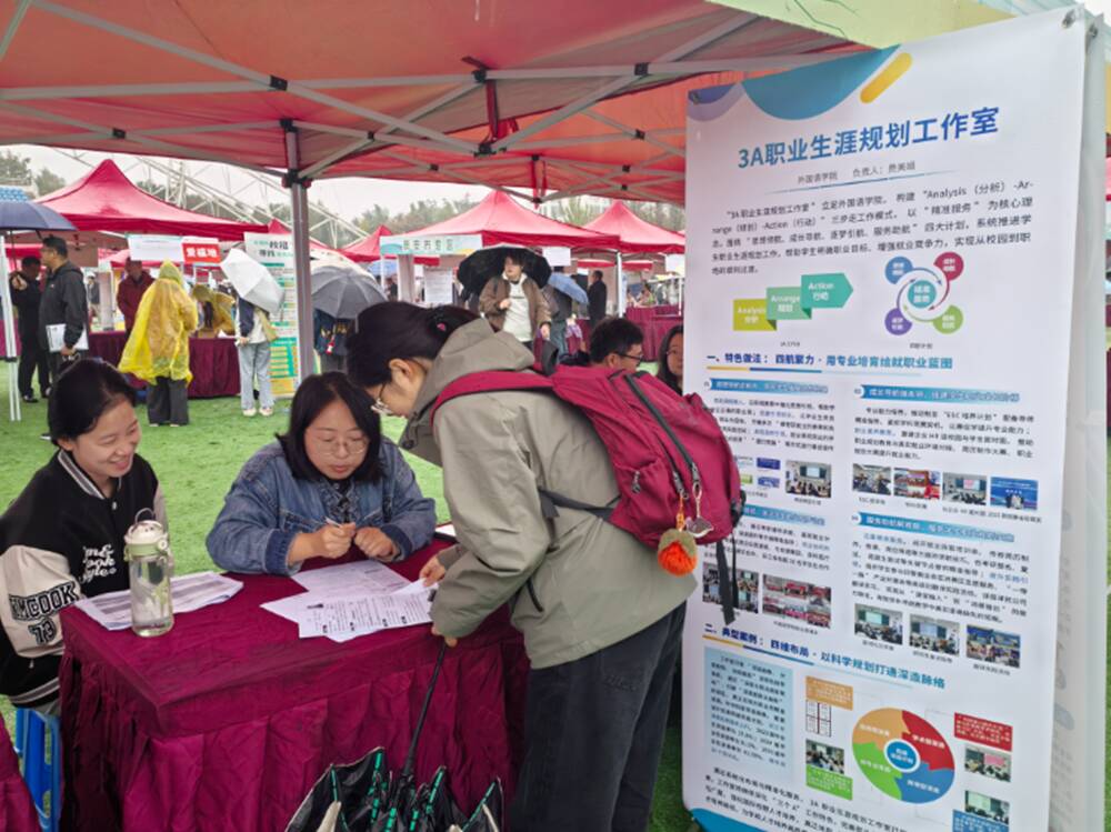 2025年10月17日,山东农业大学“就选山东”2025年高校毕业生校园招聘会顺利举行,吸引众多省内外用人单位参会,为毕业生搭建起优质就业对接平台。活动现场,外国语学院“3A职业生涯规划工作室”特设服务摊位,依托其“精准服务”核心理念,为求职学生提供一对一就业规划指导与简历修改服务,助力学子提升求职竞争力。