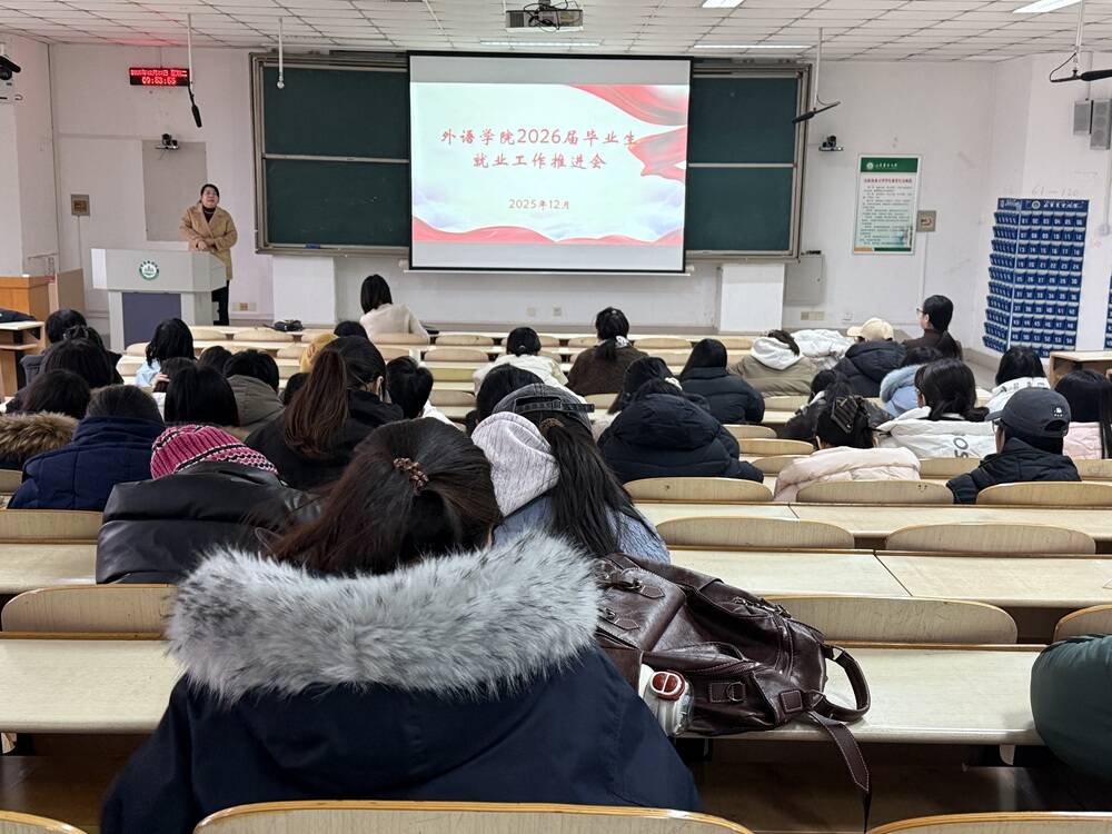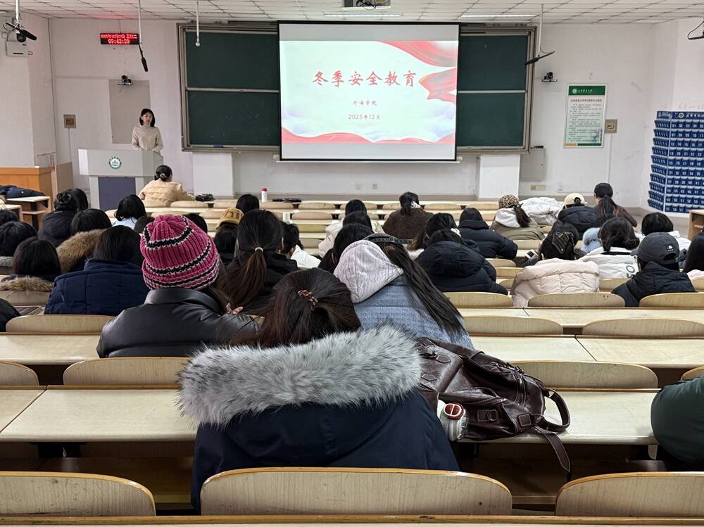12月23日,外国语学院于泮河校区勤学楼N104召开2022级毕业生就业推进会暨冬季安全教育大会。学院党委副书记费美娟、团委书记李娜、辅导员孙晓彤及2022级全体本科生参与会议。