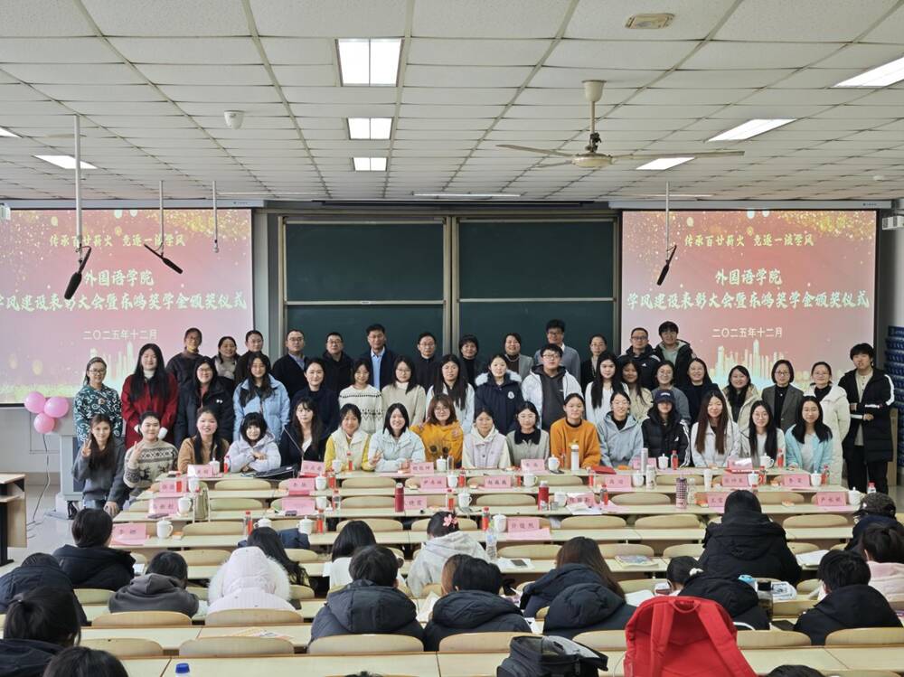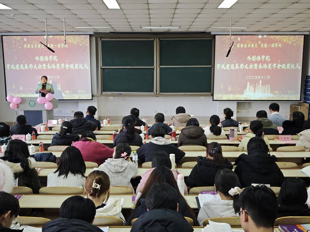 12月26日,外国语学院在泮河校区勤学楼N204举办“传承百廿薪火,竞逐一流学风”学风建设表彰大会暨东鸿奖学金颁奖仪式。学院班子成员、各系室主任、专业主任、部分教师代表、全体辅导员、24级和25级全体学生参加会议。